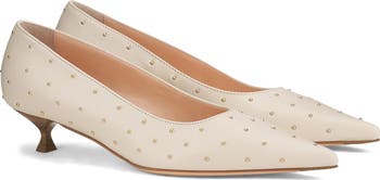 Polished studs illuminate the classic silhouette of a pointy-toe pump lifted by a classic kitten heel.