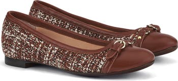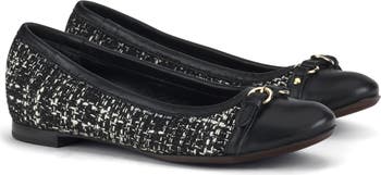 A buckle-belt updates the usual tied bow at the leather cap toe of this tweed ballet flat.
