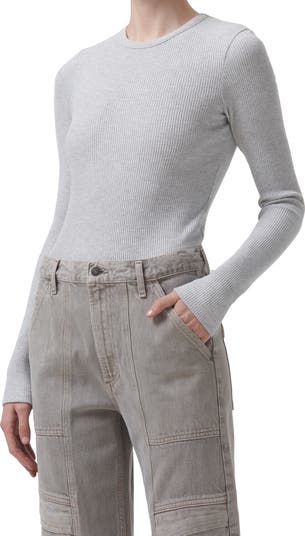 A styling essential for layering or wearing solo, this fitted top is made with soft, stretchy ribbed fabric and extended long sleeves.