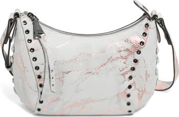 Crafted from premium pebble-grain leather, this stylish crossbody bag features a roomy main compartment detailed with glossy grommets for a street-savvy finish.