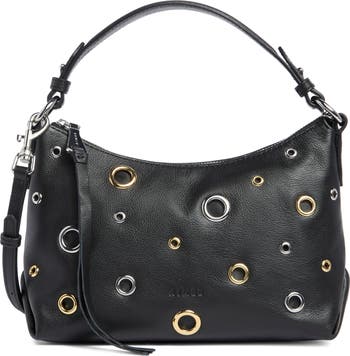 Two-tone grommets bring contemporary dimension to this sleek faux-leather shoulder bag fashioned with a top handle and removable, adjustable strap.