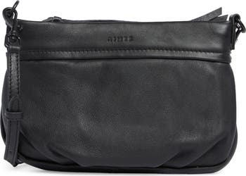 An embossed logo and tonal stitching detail the front of this pebbled-leather crossbody fitted with a compact interior.
