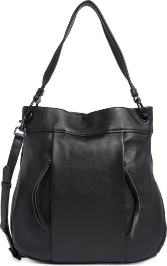An embossed logo and fringe zippers detail the front of this pebbled-leather hobo fitted with an optional shoulder strap for carrying versatility.