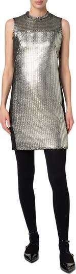 A laminated metallic finish brings a futuristic look to the corduroy front panel of this sleeveless dress styled with a modest-height mock neck.