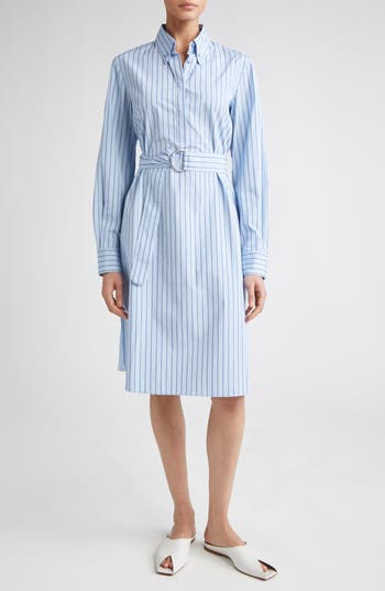 Two-tone blue-hued stripes further the officewear aesthetic of this cotton-poplin shirtdress topped with a button-down collar and a covered half placket. A waist-defining self-belt capped with a signature tonal dot completes the look.