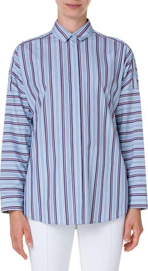 The classic poplin shirt is almost totally reimagined with buttons along the shoulders and under the sleeves, wayward stripes and an inverted back pleat.