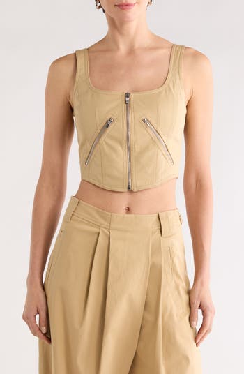 A plethora of zippers bring edgy style to this stretch-cotton corset top cut to a flirty cropped length.