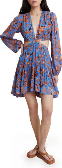 A vibrant print adds depth to this rich silk dress designed with a sultry deep V-neck, airy waistline cutouts and a flouncy hem.