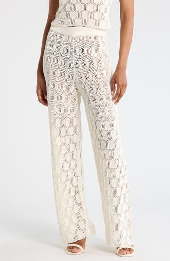 These cotton‑blend pants feature a comfortable ribbed waist and an allover openwork knit pattern giving them an airy, textured look with easy, relaxed style.