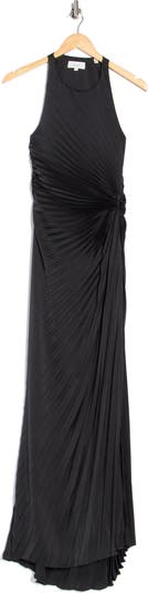Make an elegant appearance in this sleeveless satin gown showcasing an artfully knotted waist accented by sunburst pleats and a graceful side slit.