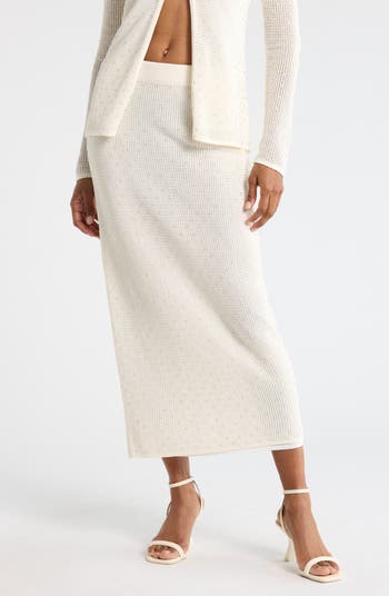 Light-catching crystal embellishments put a glamorous spin on this open-knit midi skirt made from a soft cotton blend.