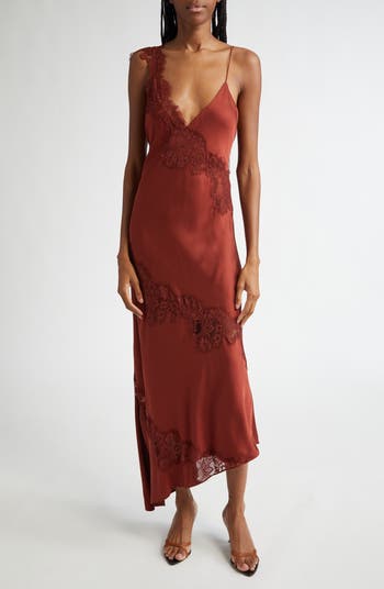 Turn heads in this glossy satin slipdress designed with lovely lacy accents and asymmetric straps.