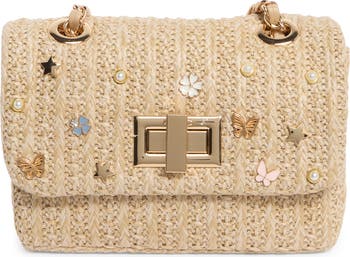 Playful motifs and a woven raffia exterior bring sunny-day styling to this crossbody bag fitted with a compact interior.