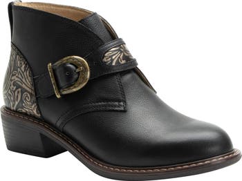 A carved buckle and debossed panels give a contemporary twist to this Western-inspired bootie.