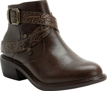 Artful embossing highlights the crisscrossing straps of a burnished leather bootie designed for optimal comfort and support.