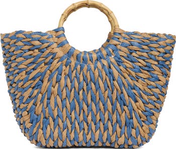 Embolden your warm-weather look with this straw tote furnished with bamboo-shaped handles for carrying convenience.