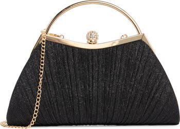 Metallic threads and rhinestones give all the glamour and shine to a structured clutch outfitted with an optional drop-in chain strap.