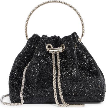 Glam up your night-out look with this sparkly bejeweled bucket bag framed by a rhinestone-embellished O-ring handle and gleaming chain drawstring.