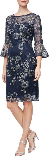 Add a silvery splash to cocktail hour in a flowery sheath finished with ruffle-decked sleeves.