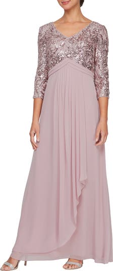 Dazzling sequins twinkle like stars at twilight on this elegant gown cut with a demure V-neck and form-fitting three-quarter sleeves.