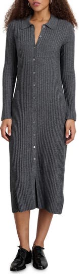 Wide ribbing adds an extra element of texture to a cashmere-softened knit dress topped with a classic spread collar.