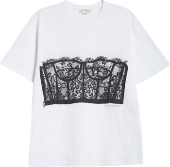 A lace boned corset from the archives was digitally scanned and photoprinted onto this relaxed cotton tee for a behind-the-scenes look at garment construction.