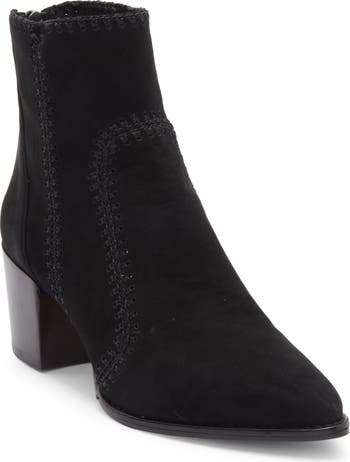 A pointy toe and block heel balance a whipstitched suede bootie fashioned with a back zipper for easy entry.