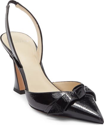 A pointy toe and tapered heel balance an Italian-made leather pump fashioned with an elasticized slingback strap for easy entry.