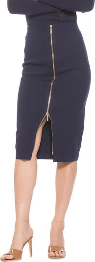 Add an eye-catching statement to your off-duty look with this curve-skimming pencil skirt that is crafted from soft and stretchy knit and styled with a front exposed zipper.
