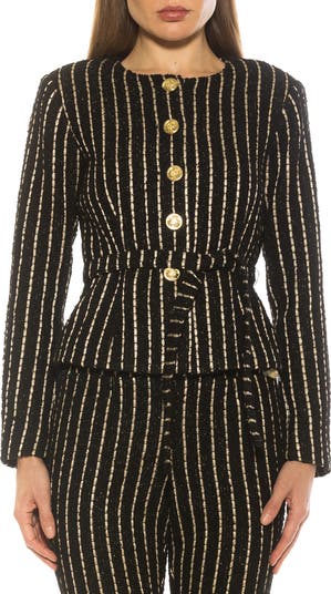 Shiny polished buttons secure this structured woven jacket that's rendered in plaid to exude classic charm.