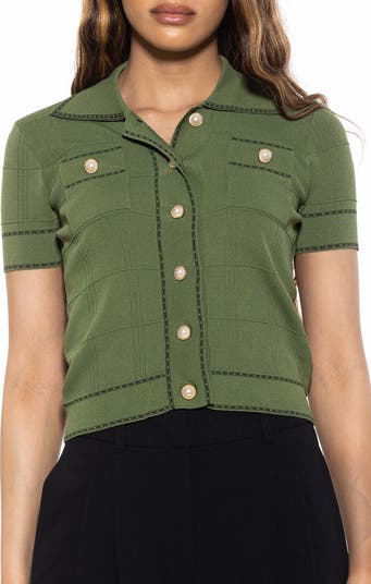 Polished buttons gleam against this chic cardigan-sweater outlined by contrast stitching.