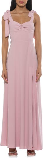 Show off elegant style in this A-line maxi dress crafted with a ruched sweetheart neck, adjustable tie straps and a thigh-high slit.