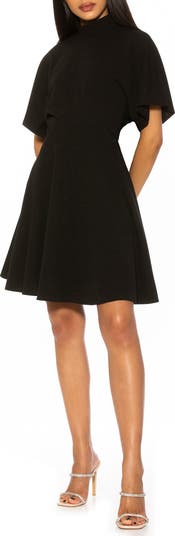 Make a lasting impression at every dance in this mock-neck dress fashioned with a rippling circle skirt that's slightly striped to emphasize the flare.