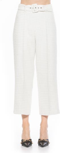 A tweedy texture adds interest to wide-legged pants that feature a high waist secured by a chunky buckle.