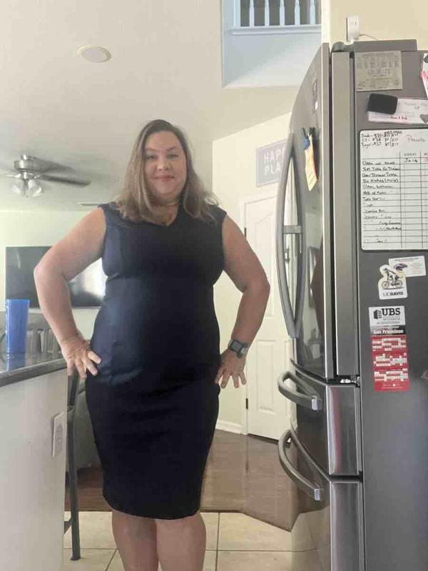 Love Love this dress. I have it in black and wear it a lot throughout the year- with sandals in the summer, boots in the winter. It started getting a tiny bit of pilling from my work bag rubbing on it. I didn’t see it available in black, so I bought the midnight blue thinking maybe that’s their version of black. It’s actually a dark navy blue. Super cute though. I’m going to keep it anyway and wait to hopefully see the black again soon. I’m 5’5” 135# 34D and the medium is perfect. Don’t feel like I have to be sitting up straight and sucking my tummy in. It’s very very flattering.