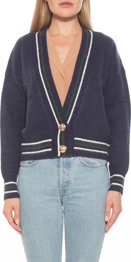 Tipped rib knit hems create a varsity inspired look on a V-neck cardigan that adds extra warmth to your look.