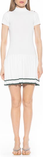 A pleated hem piped with stripes lends preppy vibes to this short-sleeve dress knit with a hint of stretch offering all-day comfort.