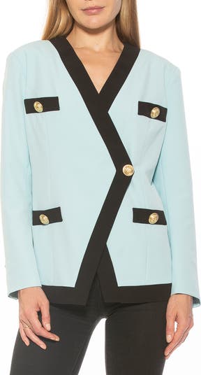 Contrast trim brings chic style to a two-tone blazer cut in an oversized fit with an angled front and polished goldtone buttons.