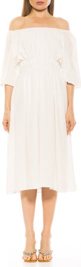 Breeze through your day in this charming midi dress fashioned with billowy puff sleeves, shirred elastic waist and a graceful fit-and-flare silhouette.