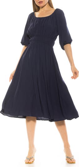 Breeze through your day in this charming midi dress fashioned with billowy puff sleeves, shirred elastic waist and a graceful fit-and-flare silhouette.