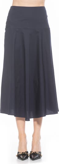 Crisp stretch-cotton poplin construction distinguishes this midi skirt featured in a swingy A-line silhouette.