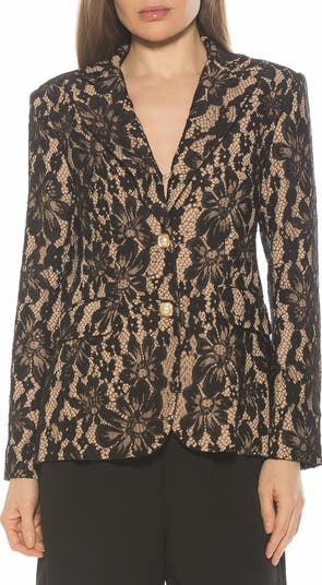 Refresh your workday essentials or polish up your weekend ensembles with this floral-lace blazer secured with pearly buttons and framed with peak lapels.