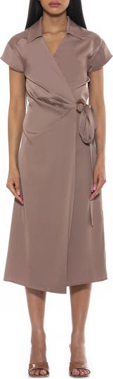 Show off sophisticated style in a surplice wrap midi dress fashioned with a neatly spread collar and O-ring tie closure.
