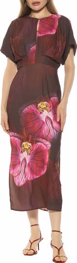Metallic beads highlight the keyhole of this elegant midi dress fashioned with gracefully draped dolman sleeves, a pretty back tie and an alluring side slit.