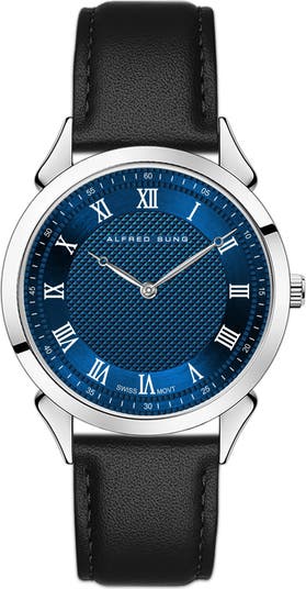 A diamond-cut dial and gleaming roman numeral indices complete the elegant design of a two-hand watch secured by a polished leather strap.