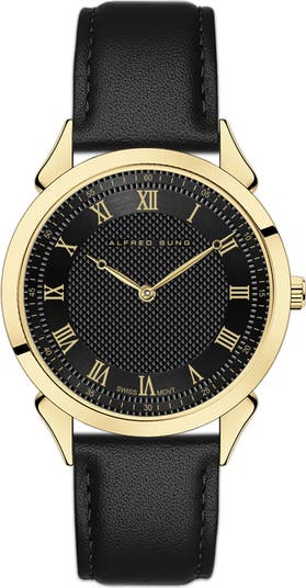 A diamond-cut dial and gleaming roman numeral indices complete the elegant design of a two-hand watch secured by a polished leather strap.