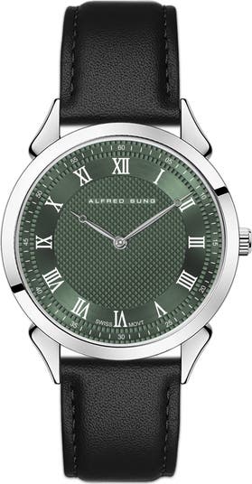 A diamond-cut dial and gleaming roman numeral indices complete the elegant design of a two-hand watch secured by a polished leather strap.