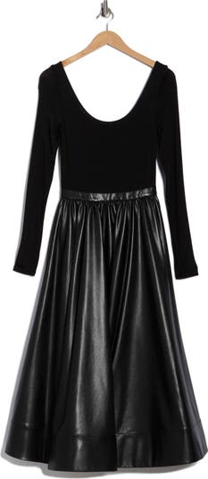 Exude sophisticated style in this mixed-media dress balancing a fitted knit bodice with a flared faux-leather skirt.