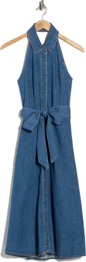 A matching tie snatches the waistline of a halter dress cut from nonstretch cotton denim for a look that combines ease with style.
