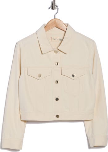 Show off timelessly cool style in this cropped trucker jacket cut from nonstretch denim in an ivory wash.